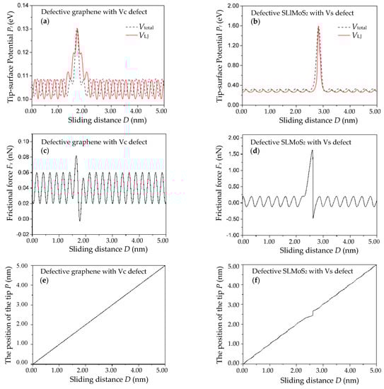 In order to quantify the tip–surface interaction potential, the Lennard–Jones (LJ) potential VLJ, which has been used to accurately describe the frictional properties at atomic-scale steps [,], is taken into consideration as the tip–surface potential in the case of the single-atom tip crossing the monovacancy defects of graphene and SLMoS2. The VLJ can be described as follows: