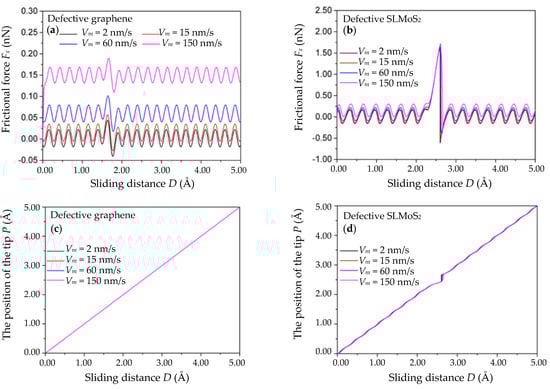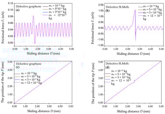 The relations of the position of the single-atom tip P vs. the sliding distance D for the above four effective masses mx of the system are shown in Figure 3c,d. It can be seen that there is virtually no change in the P vs. D curves of the monovacancy-defective graphene and SLMoS2 with different mx, which means the stick–slip motion in the vicinity of the vacancy defect is nearly independent of the effective masses mx of the system.