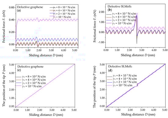 The relations of the frictional force Fx vs. the sliding distance D for four different dampings γx of the system (namely, γx = 8 × 10−5, 4 × 10−4, 2 × 10−3, and 10−2 N·s/m) are shown in Figure 4a,b. The cx, Vm, and mx are set to 10 N/m, 40 nm/s, and 10−8 kg, respectively. The results show that the frictional forces Fx of the monovacancy-defective graphene and SLMoS2 increase with the damping γx. It can be explained by Equation (1) that the frictional force Fx = cx (xM − xt) = is positively correlated with the damping γx, which is in agreement with the definition of the frictional force in the PT model []. However, the amplitudes of the frictional forces including the enhanced frictional forces in the vicinity of the vacancy defect and the periodic frictional forces of the monovacancy-defective graphene and SLMoS2 increase with decreasing γx, as shown in Supplementary Figure S1a,b. This negative correlation between the amplitude of the frictional force and the damping γx is in accord with the physical meaning of the damping term in the PT model, namely, the term considering the mechanisms of the energy dissipation in atomic-scale friction [,].
