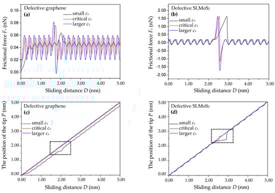 Due to the great difference in the critical spring constants cx (the curvature of the tip–surface interaction potential) of the monovacancy-defective graphene and SLMoS2 in this work (the critical cx is 0.91 and 17.18 N/m for the monovacancy-defective graphene and SLMoS2, respectively, as calculated in the beginning of Section 3), it is reasonable to set three different cx which are based on their respective critical values cx and separated by a amplitude of 5 times. Specifically, the small spring constants cx, the critical spring constants cx, and the larger spring constants cx of the monovacancy-defective graphene are set to 0.18, 0.91, and 4.55 N/m, respectively. The small spring constants cx, the critical spring constants cx, and the larger spring constants cx of the monovacancy-defective SLMoS2 are set to 3.44, 17.18, and 85.9 N/m, respectively. Figure 6a,b show the relations of the frictional force Fx versus the sliding distance for the three different spring constants cx of the pulling spring. The γx, Vm, and mx are set to 10−3 N·s/m, 40 nm/s, and 10−8 kg, respectively. It is seen that the amplitudes of the frictional forces of the monovacancy-defective graphene and SLMoS2 increase with the spring constants c. However, the details of the observed variations in the frictional forces of two materials are distinctly different. For the monovacancy-defective graphene, all the frictional forces including the enhanced frictional forces in the vicinity of the vacancy defect and the periodic frictional forces are positively correlated with the spring constants cx. For the monovacancy-defective SLMoS2, the maximum frictional force Fxmax and the periodic frictional forces almost keep constant at different cx while the amplitude of the minimum frictional force Fxmin in the vicinity of vacancy point defects increases with the cx.