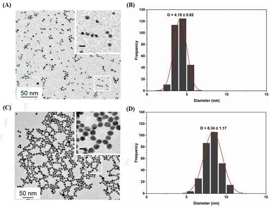 Representative Transmission Electron Microscopy (TEM) micrographs and nanoparticle (NP) size distribution analyses of Pd4 (A,B) and Pd8 (C,D). Scale bars in the insets: 10 nm.