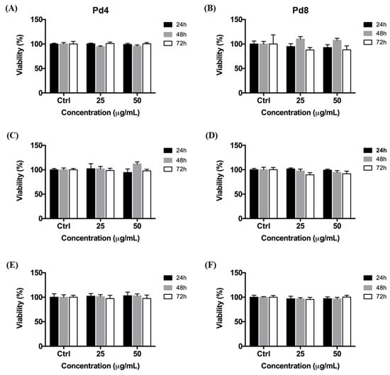 Viability of HeLa (A,B), MCF-7 (C,D), and Caco-2 (E,F) cells after treatment with increasing concentrations of Pd4 (A,C,E) and Pd8 (B,D,F) for 24, 48, and 72 h. Treated cells viability is expressed as a percentage relative to untreated cells (Ctrl). Results are reported as mean ± SD. The experiments were repeated three times and performed in triplicate.