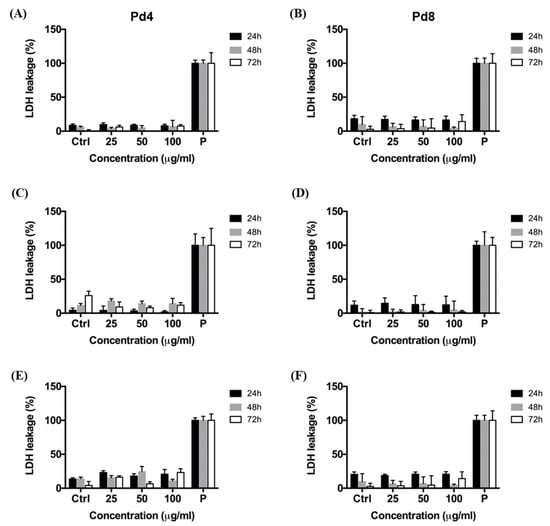Lactate Dehydrogenase (LDH) release in HeLa (A,B), MCF-7 (C,D), and Caco-2 (E,F) cells after treatment to increasing doses of Pd4 (A,C,E) and Pd8 (B,D,F) for 24, 48, and 72 h. LDH leakage of NP treated cells is expressed as a percentage relative to cells exposed to lysis buffer (P). Results are reported as mean ± SD. The experiments were repeated three times and performed in triplicate.