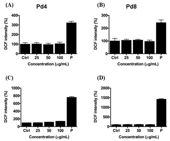 Reactive Oxygen Species (ROS) levels in HeLa (A,B) and Caco-2 (C,D) cells, after treatment with increasing concentrations of Pd4 (A,C) and Pd8 (B,D) for 24 h, detected by DCFH-DA assay. ROS amount of NP-treated cells is reported as a percentage relative to cells exposed to 1 M H2O2 for 10 min (P). Results are reported as mean ± SD. The experiments were repeated three times and performed in triplicate.