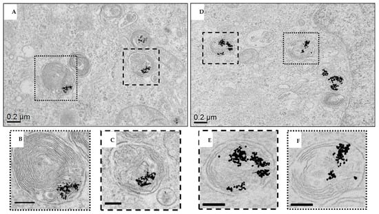 TEM analysis of HeLa cells exposed to Pd4 (A–C) and Pd8 (D–F) for 24 h. Low magnification projection images of late endosome/phagosome compartments containing Pd4 and Pd8 are reported in (A,D). (B,C) and (E,F) are higher magnification of the boxed region in (A,D). Scale bars in (B,C) and in (E,F) are 100 nm.