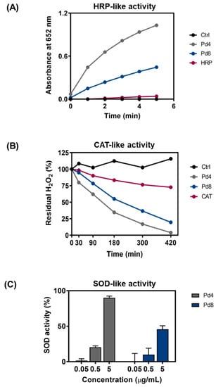 A major role to control ROS homeostasis in biological systems is played by three antioxidant enzymes, i.e., peroxidase (HRP), catalase (CAT), and superoxide dismutase (SOD). Here, we first evaluated the ability of PdNPs to mimic the antioxidant defense system in a cell-free environment and the effect of the particle size on their performance as antioxidants. HRP is the biological enzyme responsible for the decomposition of hydrogen peroxide (H2O2) into water, through the oxidation of antioxidant molecules, such as glutathione. We evaluated the ability of PdNPs to act as HRP mimics by monitoring the oxidation rate of 3,5,3′,5′-tetramethylbenzidine (TMB) in presence of H2O2. We found that both Pd4 and Pd8 are able to efficiently catalyze the oxidation of TMB, even at very low concentrations (Figure 7A). Interestingly, a size-dependent catalytic activity was observed, in qualitative agreement with a previous study on PtNPs []. Pd4 were found to be significantly more efficient than Pd8 in catalyzing the TMB oxidation, due to their higher surface-to-volume ratio. Remarkably, both NPs oxidized TMB with comparable or higher performance than the natural HRP enzyme. This is likely due to the ability of Pd nanozymes to operate in a wider range of conditions, such as non-physiological temperature, high H2O2 concentrations, and acidic pH (required for the TMB assay), which partly inhibit the activity of the biological enzyme []. Their lower sensitivity to the external conditions (broader range of pH and temperature) suggests the superior versatility of Pd nanozymes over the natural HRP, as artificial peroxidases in biological applications.