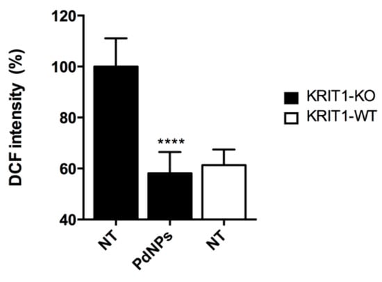 Oxidative stress is associated with aging and several pathologies, including cardiovascular diseases, cancer, and neurodegenerative disorders []. Moreover, the correlation between oxidative stress and vascular dysfunctions in cerebral pathologies has been clearly demonstrated [,,] as in the case of the major cerebrovascular diseases of genetic origin, CCM. There is evidence that loss-of-function mutations in one of three ccm genes, namely ccm1 (krit1), impairs cell ability to regulate mitochondrial homeostasis, leading to ROS accumulation and consequent endothelial cell dysfunctions []. The high levels of ROS in krit1 knock-out (KRIT1-KO) cells, derived from a murine model of the human CCM pathology, makes them an optimal cellular tool [] to test the properties of PdNPs as antioxidant nanozymes. Therefore, we treated KRIT1-KO mouse embryonic fibroblasts (MEFs) for 48 h with PdNPs (25 μg/mL) and we tested the ROS scavenging activity of the nanozyme by DCFH-DA assay. A statistically significant ROS decrease in KRIT1-KO cells was observed, as compared with untreated ones (Figure 8). Interestingly, ROS levels in treated KRIT1-KO cells reached that of the wild type (KRIT1-WT NT), demonstrating the ability of PdNPs to act as efficient antioxidants for the recovery of the physiological redox balance.