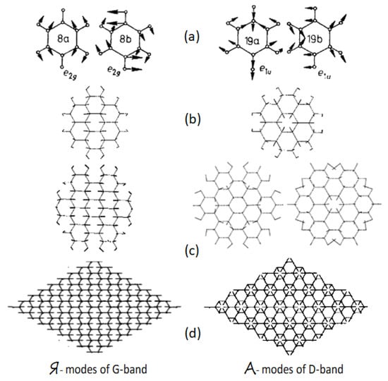 Detailed consideration of the PAHs polarizability performed in the extensive study [,,,,,,,,,,] showed that parallel-to-bond vibration forms, attributed by the authors to the type  []), promote a steady intense one-phonon Raman signal G in all the studied molecules. The feature does not depend on the molecules’ symmetry and shape, and is caused by the  derivatives, which all are positive. In contrast, normal-to-bond vibration forms of type  [] promote, in this case, both positive and negative  derivatives, due to which the intensity of D band is tightly connected with the “quality” of C=C bonds, which is reflected in the vibration forms. Therefore, if the bonds are identical, the contribution of  modes into the one-phonon signal is nil. In the opposite case, the signal is not nil and is bigger, the bigger the difference between the bonds []. This conclusion has been approved on a number of PAH molecules, whose RSs were obtained and analyzed [,,,,,], as well as by latest theoretical studies []. The extension of the above consideration over graphene crystal have revealed that e2g mode at Г point of the first Brillouin zone is typical -mode, while A’1 mode at K point clearly reveals  character (Figure 3d). The findings undoubtedly evidence a peculiar collective character of the graphene phonons caused by benzenoid-hexagon structure. Therefore, until the honeycomb packing of benzenoid units is not broken, the graphene molecules and/or supramolecules are characterized by the D-G patterned Raman spectra. Only a complete destruction of the sheet leads to this feature loosing, which was really observed for graphene after its extremely strong bombardment by Ar+ ions [].