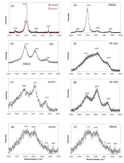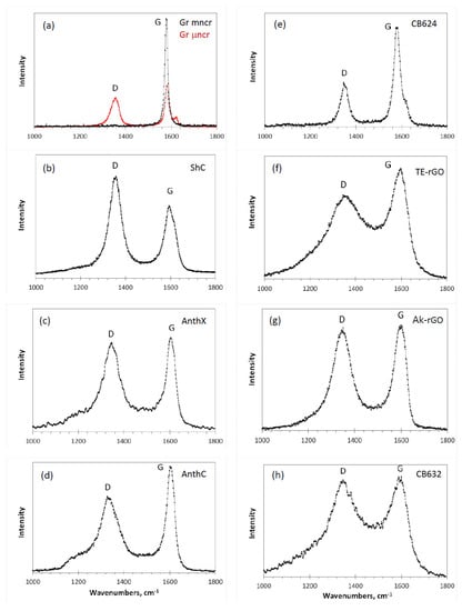 One-phonon Raman spectra of sp2 amorphous carbons at room temperature: shungite carbon (ShC), anthraxolite (AnthX), anthracite (AnthC), technical graphene TE-rGO [] and Ak-rGO [], carbon blacks CB632 and CB624, as well as mono- (mncr) and micronanocstructured (μncr) graphites, respectively; additional (a–h) marking facilitates the spectra description. Intensities are reported in arbitrary units.