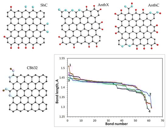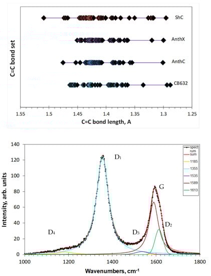 Neutron and X-ray powder diffraction of shungite carbon and anthraxolite showed that the configurations of the solid stacks formed by the relevant BSUs were identical and the closest to the packing in graphite crystal (see [] and references therein). Accordingly, these solids RSs broadening with respect to that of the PAH can be attributed to stronger effect of the BSU heteroatom necklace on the C=C BLD  in comparison with that of hydrogen atoms. Additional broadening can be caused by the variety of the necklace structure at fixed chemical content. Therefore, the difference of the ShC and AntX RSs in Figure 4b,c can be attributed to the different disturbance of the BLD  by different heteroatom necklaces, which is supported with the bond length distributions shown in Figure 5. Similarly, the difference of the AnthC RS in Figure 4d from the spectra of ShC and AntX can be attributed to the changes in the relevant necklace. Nevertheless, the structure study of the latter revealed much stronger deviation of BSUs packing from the graphite one [] due to which the RS shape, particularly in the D band region, may additionally reflect the changing of BSUs packing in this case towards a turbostratic one [].