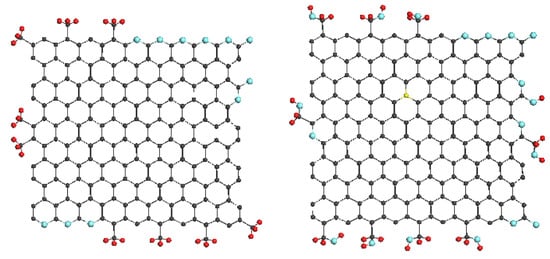 Molecular models of basic structure units of technical graphenes Ak-rGO (left) and TE-rGO (right). Light gray, red and black circles mark carbon, oxygen and hydrogen atoms.