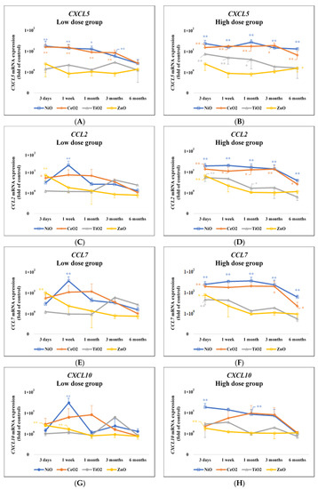 The expression patterns of CCL2 and CCL7 also showed a similar tendency to CXCL5. CCL2 genes had a significantly persistent increase in the NiO and CeO2 high dose groups, and CCL7 genes had a significantly persistent increase in the NiO high dose group. Both of the genes had an insignificant increase in the NiO and CeO2 low dose groups and in the CeO2 high dose group. There was a transient increase in the TiO2 and ZnO-exposed groups at three days or one month following intratracheal instillation.