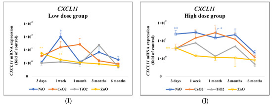 On the other hand, the gene expression of CXCL10 and CXCL11 in the NiO and ZnO-exposed groups increased transiently at three days or one week or one month following intratracheal instillation, and no difference was observed in the expression level between nanomaterials of high and low pulmonary toxicity.