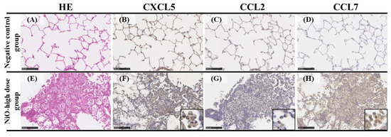 Representative images of CXCL5, CCL2, and CCL7 immunostaining in lung tissue exposed to NiO. (A–D): the negative control lungs; (A) H&E staining; (B) CXCL5 immunostaining; (C) CCL2 immunostaining; (D)CCL7 immunostaining. (E–H): the NiO-high dose exposed lungs; (E) H&E staining; (F) CXCL5 immunostaining; (G) CCL2 immunostaining; (H) CCL7 immunostaining. All of the examples illustrate findings at 1 month after intratracheal instillation: Positive cells of CXCL5, CCL2, and CCL7 immunostaining on NiO-exposed lungs were mainly macrophages. (internal scale bar = 100 μm for all).