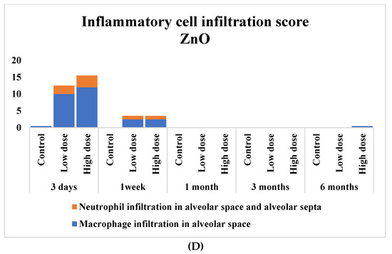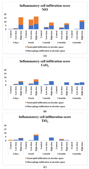 Figure 3 shows the inflammatory cell infiltration scores of the pathological features in the rat lungs. There was sustained inflammation in the rat lungs that were exposed to NiO and CeO2, while only transient inflammation was observed in rat lungs exposed to TiO2 and ZnO. In Figure 4, pulmonary inflammation appears mainly in the macrophages and neutrophils in the rat lungs that were exposed to NiO, and in the macrophages in the rat lungs exposed to CeO2, respectively. We previously reported that inflammatory cells influx in the bronchoalvelar lavage fluid was persistent in the NiO and CeO2 groups, whereas it was transient in the TiO2 and ZnO groups and these findings were similar to the pathological features of each group [19,20,21]. Figure 5 shows the relationship between the inflammatory cell score and the gene expression of CXCL5, CCL2, CCL7, CXCL10, and CXCL11 in the lung exposed to the nanomaterials. The expression levels of CXCL5, CCL2, and CCL7 at one week and one month correlated moderately or strongly with the degree of inflammatory cell infiltration in the lung tissue.