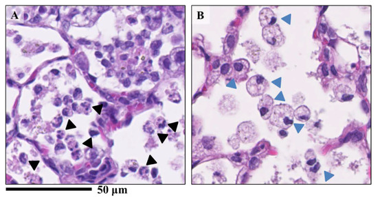 Lung samples sectioned with H&E staining exposed to nanomaterials intratracheally. (A) the NiO-high dose exposed group; (B) the CeO2-high dose group. There were differences of infiltrating inflammatory cells between nanomaterials. While mainly neutrophils and macrophages were found in the alveoli in the NiO-high dose group (A), macrophage-based inflammatory cell infiltration was observed in the CeO2-high dose group (B). Black arrow heads indicate neutrophils and blue arrow heads indicates macrophages.