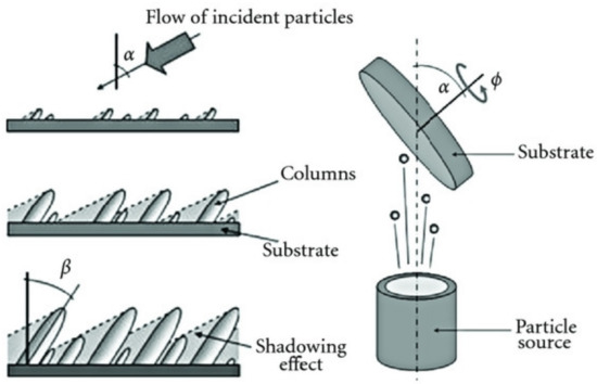 Schematic description of the ballistic shadowing effect during thin-film growth in glancing angle geometry (reproduced from [25], Hindawi, 2012).