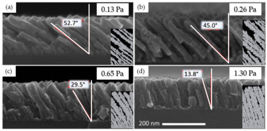 Ti thin films synthesized at 150 W and 85° for various deposition pressures: (a) 0.13; (b) 0.26; (c) 0.65; (d) 1.3 Pa with the corresponding simulations. The red angle accounts for the average columnar tilt angle (β) estimated by over 20 columns (adapted from [50] with permission from Elsevier, 2017).