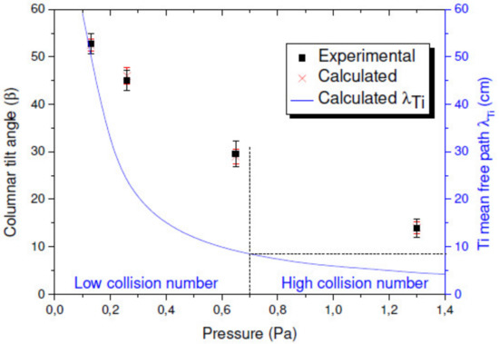 The comparison between experimental and calculated values of β as a function of Pdep, as well as the calculated λ value for Ti atoms, is shown in Figure 7. The critical Pdep value from which λ becomes smaller than the target-to-substrate distance is estimated as ~0.7. Very few collisions occur through the vapor phase below this value, while numerous collisions between particles occur at higher pressure.