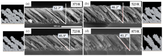 Ti thin films synthesized at 150 W, 0.13 Pa, and 85° for various substrate temperatures: (a) 373; (b) 523; (c) 723; (d) 873 K with the corresponding simulations. The red angle accounts for the average columnar tilt angle (β) estimated by over 20 columns (adapted from [50] with permission from Elsevier, 2017).