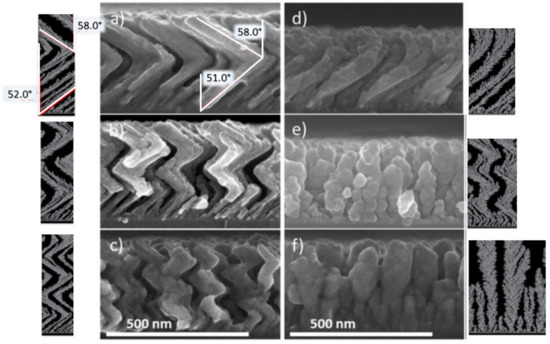 Ti thin films (150 W, 0.13 Pa, 85°) deposited at various rotations of the substrate to generate: (a–c) Zigzag structures; (d) helicoidal structures at 0.1°/s; vertical pillars at (e) 1.0°/s and (f) 10.0°/s with the corresponding simulations. The red angle accounts for the average columnar tilt angle (β) (adapted from [50] with permission from Elsevier, 2017).