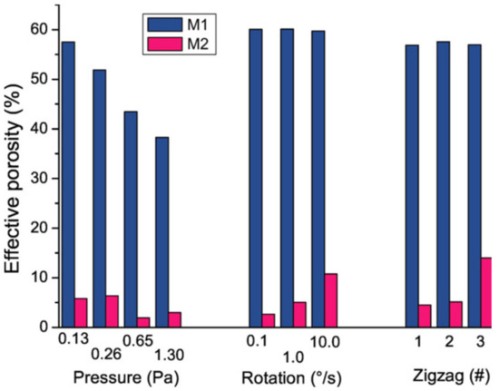 For Ti thin films, similar simulations have been performed with even more details. Indeed, in this case, the porosity has been computed as an “effective porosity,” Фe, because the porosity value depends on the size of the object that could penetrate the system. To do this, two molecules (M1 and M2) having different diameters (0.64 and 3.20 nm, respectively) have been considered to penetrate the Ti nano-sculpted films. The calculated ratio between the total porosity volume and the accessible porosity for M1 and M2 molecules penetration gives the Фe for each molecule. This gives a flavor of the organization of the porosity at the nanoscale. Many models have been performed for different types of Ti nano-sculpted films. Figure 12 summarizes the evolution of Фe with various experimental parameters for M1 and M2 molecules.