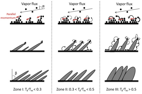 Simulations were, thus, performed for the same conditions than for the experiments to evaluate the impact of the diffusion phenomena on the film morphology (see Figure 8). The agreement between the experimental and simulated data validate that the diffusion is the reason for the evolution of β with Ts. Based on that, it is possible to adapt the empirical model proposed by Movchan and Demchishin for thin films deposited at oblique angles with different Ts [50].
