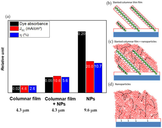 These results can be explained by the synergistic effect between the monocrystalline column, which act as extremely good conductive media for the electron, while the additional nanoparticles in the inter-columnar voids help to graft more dye and, therefore, to increase the amount of generated photoelectrons. On the contrary, for a conventional nanoparticle anode, the adsorption of the dye is of very good quality, but the generated electrons are lost due to the already mentioned defective structure of the anode. These mechanisms are depicted in Figure 21b–d. It is worth stressing that the comparison between the different photoanode architectures was not made with films of the same thickness, owing to the following assumption: It is accepted that Jsc linearly increases as a function of the thickness of the nanoparticle-based thin film, before reaching a plateau and finally decreasing [69]. As the thicknesses considered in our work (<10 µm) still belong to the linear region, the recombination rate is not yet a limiting parameter, allowing our discussions and conclusions to be meaningful.