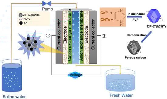 The demand and consumption of natural resources have substantially increased over the last few decades due to the rapid growth of the global population and industrialization. In particular, the shortage of fresh water has been of one of the critical issues facing humanity. The purification of saline water including seawater and brackish water is the most effective alternative for obtaining fresh water, since most water (more than 97%) on earth is seawater. Capacitive deionization (CDI) based on ion electrosorption is an emerging desalination technology due to its low energy consumption and environmental friendliness compared to conventional purification technologies [1,2,3,4,5,6,7,8,9,10]. When an external electric field is applied to a CDI cell, charged ions such as sodium and chloride ions in the saline water are migrated and electrostatically adsorbed onto the oppositely charged electric double layer (EDL) formed at the interface between the electrode and the electrolyte. When the electrode surfaces are saturated with adsorbed ions, a discharging process involving the application of zero or reverse potential is required to remove adsorbed ions, thus allowing for the regeneration of electrodes. Carbon-based materials including activated carbon (AC), carbon aerogel, carbon cloth, and carbon fiber have been mostly used in CDI electrodes due to their high surface area, electrochemical stability, and abundance. However, the low electrical conductivity and non-regular pore shape and size distribution of carbon-based electrodes limits the maximization of the salt removal performance of a CDI desalination system using such electrodes. Various approaches for realizing enhanced desalination performance have been reported so far. The addition of CNT could improve the desalination performance by formation of a conducting bridge [11]. There have also been efforts to improve desalination capacitance by involving redox active materials including metal oxide, conducting polymer, and hybrid materials [12,13,14,15,16]. Metal-organic frameworks (MOFs) have been widely investigated porous materials with periodic three-dimensional structures consisting of metal center and organic ligands. MOFs have attracted substantial attention due to their high surface area, adjustable pore size, periodical unsaturated pores of metal center, and high thermal and chemical stabilities [17,18,19,20,21,22,23]. Therefore, MOFs have been regarded as ideal materials for various applications including gas separation, catalysis, drug delivery systems, and so on [24]. Furthermore, metal ions can be removed, and the frameworks can be carbonized by post-thermal treatment, while maintaining its unique porous structure. It can produce various hybrid products such as metallic oxide, metal decorated carbonaceous materials, and nanoporous carbon structure [25,26,27]. Various types of MOFs have been investigated as electrodes for energy storage systems such as secondary batteries, supercapacitors, and fuel cells. In particular, zeolitic imidazolate frameworks (ZIFs) involving ZIF-8 and ZIF-67 have been widely utilized due to their excellent physical and chemical characteristics and their highly abundant microporous structures [28,29,30,31,32]. It has been reported that nitrogen-doped carbon materials substantially enhance electrical conductivity and provide better wettability of the electrode surface with electrolyte. However, the conductivity of most untreated MOFs is relatively low, which limits their applications for electrochemical devices. Nanostructured carbon materials, including carbon nanotubes (CNTs) and graphene, have been widely investigated as highly conductive agents, which can significantly enhance the electrical interconnectivity between individual electrode particles, including AC [11,33,34,35,36].