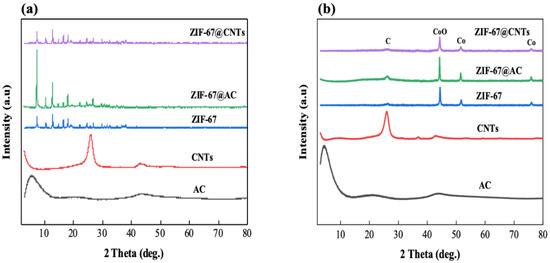 The crystalline structures of the synthesized ZIF-67 were characterized by X-ray Diffraction (XRD) analysis, as shown in Figure 3. AC and CNTs showed the characteristic peaks at 5.6° and 43.7° (AC) and 26.1° and 42.9° (CNTs) of 2θ originating from the (002) and (100) planes, respectively, of the graphite structure. Freestanding ZIF-67 synthesized without CNT or AC showed the main characteristic crystalline peaks at 7.4°, 12.9°, 16.6°, and 18.2° of 2θ as well as some other minor peaks, which are consistent with the findings of previous studies [37,38]. When ZIF-67 was synthesized onto AC and CNTs, its characteristic peaks were well maintained, as shown in Figure 3a, suggesting that all ZIF-67 are pure with high crystallinity. Following carbonization at 900 °C for 12 h, the characteristic peaks of AC and CNTs were well maintained. By contrast, the ZIF-67 samples, including ZIF-67 onto AC and CNTs, showed structural transformations after carbonization. The main ZIF-67 characteristic peaks, and the long-range ordered crystalline peaks in particular, mostly disappear. At the same time, the broad (002) peak and (111), (200), and (220) peaks were generated. The peaks at 26.2°, 44.3°, 51.6°, and 75.9° of 2θ represent the carbonaceous materials ((002)), Co and CoO ((111), (200), and (220)), respectively [39,40,41]. This indicates the complete conversion of pristine ZIF-67 to nanocarbon structures and the transformation of the ZIF-67 framework during carbonization. The morphological characterizations, including TEM (Figure 2) and XRD (Figure 3), confirm that the uniform ZIF-67 nanoparticles were successfully synthesized onto CNT templates.