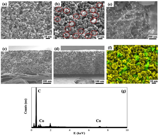 FE-SEM images of CDI electrodes coated onto graphite foil consisting of activated carbon (AC) only (a,c) and AC with ZIF-67@CNTs (b,e,d). (a,b,e) show top views and (c,d) show cross-sectional views. (e) High-magnification image of AC with ZIF-67@CNTs. (f) Corresponding EDS elemental mapping analysis of FE-SEM image (b). (g) EDS spectrum of AC with ZIF-67@CNTs electrode.