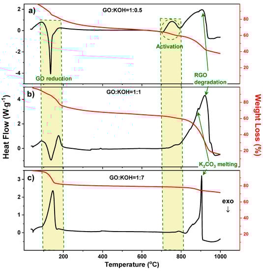 Simultaneous Differential Scanning Calorimetry (DSC)-Thermogravimetry (TG) was used to investigate the thermal evolution of the GO-KOH samples. The DSC curves of three samples prepared with a KOH/GO weight ratio of 0.5, 1, and 7 are shown in Figure 1. The samples with KOH/GO of 0.5 and 1 show the typical DSC profiles of GO material, i.e., they show a clear exothermal peak between 100 and 210 °C [31], which arises from the reduction of GO, which consists in the degradation of the most liable functional groups on the carbon network, as confirmed by the weight loss in the TG curve. However, the area of this exothermal peak largely decreases with increasing the KOH/GO ratio from 0.5 to 1. In the case of the sample with KOH/GO = 7, the exothermal peak has totally disappeared and only a weak endothermic response left (Figure 1c). This trend is not surprising because it has been reported that, in strong bases, it can induce partial degradation of GO functional groups even at room temperature [32,33], Therefore, GO samples with high KOH content were partially reduced before DSC analysis. In addition, KOH crystals dispersed in GO can easily adsorb moisture from the ambient. The adsorbed water would evaporate above 100 °C, yielding the endothermic peak (DSC curve) and the mass loss (TG curve) in Figure 1c.