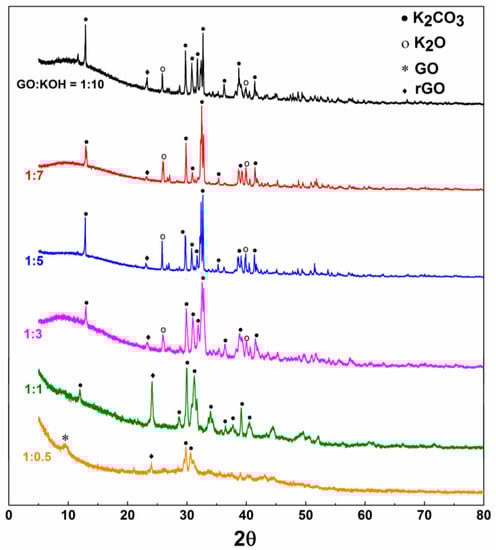 Figure 2 shows the X-ray diffraction patterns of samples with six different KOH/GO mass ratios, namely 0.5, 1, 3, 5, 7 and 10, after been annealed at 700 °C for 1 h. All the XRD curves present the typical rGO peak at around 25° [39]. The other peaks can be assigned to K2CO3 and K2O (Jade PDF card 49-1093 and 26-1327, respectively) [34,35], supporting the above reported reactions (Equations (1)–(4)).