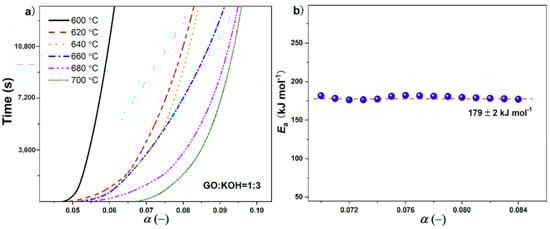 where f(α) is an undefined function of the GO+KOH activation, A is the pre-exponential factor, and R is the universal gas constant. The resulting Ea vs. α curve is shown in Figure 4b. Through the whole activation process, the value of Ea is nearly constant, Ea = 179 ± 2 kJ∙mol−1, which indicates that the inherent energy barrier for the decomposition of basal carbon plane in GO by KOH activation is constant.