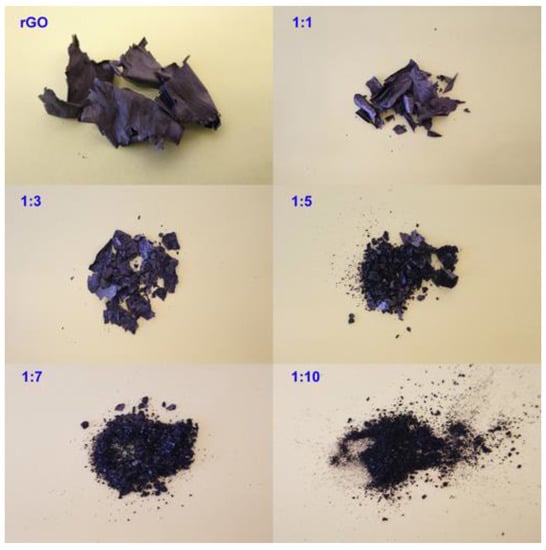 Pictures of PRGO samples after thermal treatment at 700 °C for 1 h followed by washing with 5% HCl solution without any physical treatment, like grinding or crushing, are shown in Figure 5. The rGO sample obtained with no addition of KOH keeps its flaky shape after annealing. On the contrary, the addition of KOH causes partial degradation of the carbon materials during heat-treatment and therefore rGO flakes lose the graphene layers’ integrity and break into small fragments. With the increase of KOH content, the consistency of PRGO samples becomes more powdery. The proper ratio of KOH could generate a large quantity of nanopores inside GO; however, an excessive KOH content would have a negative effect on the PRGO integrity.