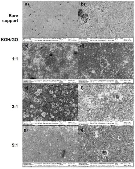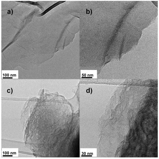 In order to gain insight into the structure of PRGO carbon network, TEM measurements were carried out as shown in Figure 6. Two samples with KOH/GO = 0 and 5 are selected here to display the change of morphology due to the presence of potassium hydroxide. Figure 6a,b shows the micrograph of the reference rGO sample (KOH/GO = 0). The carbon layers could be exfoliated easily, so that a micrograph of single complete and smooth carbon sheet was obtained. After adding KOH (Figure 6c,d), the carbon sheets become twining and folded, and are more difficult to exfoliate by sonication during the preparation of the sample before analysis. Moreover, the sample activated with KOH presents a high density of disordered and interconnected nanochannels, making it a potential material for molecular separations systems.