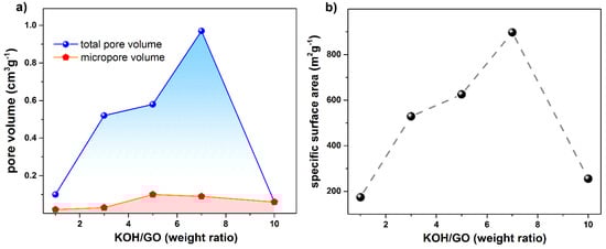 The PRGO sample with KOH/GO = 1 has a specific pore volume 0.10 cm3∙g−1 (in Figure 8a). With the increase in the amount of KOH, the specific pore volume increases as well. In the samples with KOH/GO = 3, 5, and 7, the specific pore volumes are 0.52, 0.58, and 0.97 cm3∙g−1, respectively. In general, the addition of KOH increases RGO porosity. However, when an excessive amount of KOH is added, the carbon network collapse and the specific pore volume decrease dramatically: it reduces to 0.06 cm3∙g−1 in the KOH/GO = 10 sample. Consequently, the calculated BET specific surface area presents a similar trend in Figure 8b. The specific surface area of the KOH/GO = 1 sample is 174 m2/g. After increasing the amount of KOH, the specific surface area increases to 897 m2∙g−1 for KOH/GO = 7 sample. However, the surface area decreases with further addition of KOH.