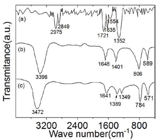 The broad strong absorption band centered at 3396 cm−1 originated from the stretching vibrations of surface and interlayer hydroxyl groups [42], as shown in Figure 2b. The weaker band at 1648 cm−1 came from the bending mode of water molecules. Bands centered at 589 cm−1 were derived from the stretching and bending vibration of metallic oxygen (M-O) or metallic hydroxyl (M-OH) [43]. The FTIR spectrum of Co–Al LDHs after adsorption of hexazinone is shown in Figure 2c. In hexazinone adsorbed on Co–Al LDHs, two bands at 2975 and 2849 cm−1 disappeared, and a new band of hexazinone appeared at 1349 cm−1, which indicates symmetric vibrations of hexazinone.