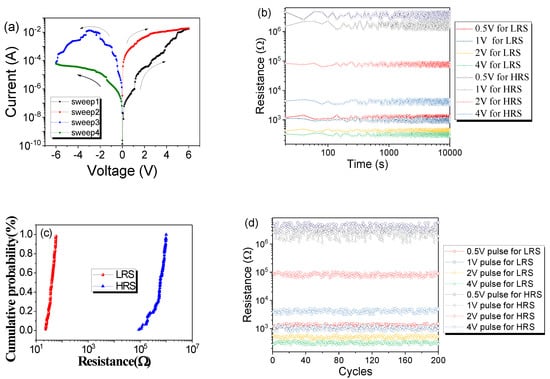 Electrical characteristics of the Co–Al LDHs memristor were tested under the voltage sweep sequence of 0 V → +6 V, 0 V → +6 V, 0 V → −6 V, and then 0 V → −6 V. When sweeping positive external voltage from 0 to +6 V, the resistance converted gradually from high resistance state (HRS) to low resistance state (LRS). LRS could be maintained during the second positive voltage sweep until an opposite external voltage was applied LRS was gradually converted to HRS, and HRS was maintained during subsequent negative voltage scanning, as shown in Figure 3a. This indicates that the device has typical bipolar resistive switching behavior. For this memristor, the device maintains in LRS or HRS until an external voltage with opposite polarity is applied, which converts the resistance state to HRS or LRS. Furthermore, subsequent 10 consecutive voltage sweeps are shown in Supplementary Materials Figure S1. Repeatability of devices is an important prerequisite for their engineering applications. In the experiment, the I–V curves of 49 Co–Al LDHs memristor samples were tested, of which 30 samples had similar resistive properties and the remaining 19 did not. Sample-to-sample I–V characteristics for 30 Co–Al LDH memristors were shown in Figure S2. Additionally, the I–V plots of the remaining 19 are shown in Figure S3, as can be seen, and they only have a single resistive state and no resistive switching function. The calculation formula of power is p = I × V, where I represents the current and V represents the voltage. In this device, the current is 0.01 A at most, and the corresponding voltage is 6 V. Therefore, the maximum power consumption of these device is 0.06 watts.