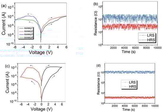 The influence of temperature on device performance has always been an important index in engineering applications. Considering that cycloqinone cannot withstand high temperatures, Co–Al LDHs memristor performance was tested at 158 °C, as shown in Figure 5. Figure 5a exhibits the I–V curves of the Co–Al LDHs memristor at 158 °C. It can be seen that the Co–Al LDHs memristor still exhibits gradual resistive switching at a high temperature. In contrast to room temperature conditions, the current in HRS and LRS significantly reduced, which may have been caused by the increase of resistance due to the intensified thermal motion of carrier molecules between the graded laminate structure of Co–Al LDHs at a high temperature. Figure 5b exhibits the data retention capability of the Co–Al LDHs memristor in HRS and LRS at −2 V constant voltage under 158 °C. With a minimum resistance ratio of about 2, the device almost loses its resistive switching capability. Such a low resistance ratio will greatly increase the misreading rate, which is far from meeting practical application requirements. Since the device does not have thermal stability at 158 °C, the device’s resistive switching and data retention characteristics are tested at 85 °C, as shown in Figure 5c,d. As can be seen, at this temperature the device has good temperature stability.