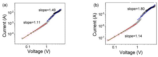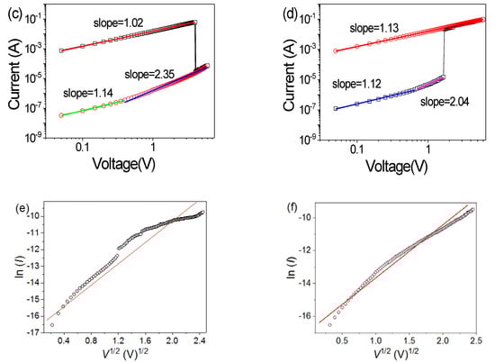 To uncover the complex resistive switching mechanism of the device, the charge carrier transport of Co–Al LDHs and Co–Al LDH-adsorbed hexazinone were analyzed by model fitting of the I−V curves in the double logarithm coordinate as shown in Figure 6a–d. For the Co–Al LDH memristor, after data fitting we found that both HRS and LRS obey space charge-limited conduction [44], as shown in Figure 6a,b. For the adsorbed hexazinone memristor, the current and voltage relationship for the negative and positive voltage region was fitted under the log–log coordinate system, as shown in Figure 6c,d. We can see it in terms of the slopes of the HRS (the I–V relationship can be approximately described as I–V with slopes of 1.14 and 1.13 followed by I–V2 with slopes of 2.35 and 2.04) and LRS (the slopes were 1.02 and 1.13). The fitted current and voltage relationship can be ascribed to Ohm’s law for LRS and space charge-limited conduction for HRS. Additionally, the ln(I)µV1/2 relationship fitting was performed for the Co–Al LDH memristor and Co–Al LDH-adsorbed hexazinone memristor, as shown in Figure 6e,f, indicating that the conduction behavior in the HRS for the Co–Al LDH memristor and Co–Al LDH-adsorbed hexazinone memristor can be ascribed to Schottky emission [45].