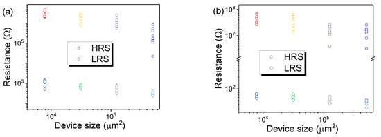 According to previous reports, the conductive filament theory is very popular [46,47]. According to this theory, resistance in LRS is independent of the size of the device. Therefore, device size dependence of the resistance in LRS and HRS for Co–Al LDHs and Co–Al LDH-adsorbed hexazinone-based memristors was performed, as shown in Figure 7. For each device size, resistance of 10 LRS and HRS tested from five devices were collected. The resistance was read at 0.2 V. According to the above experimental results, the conductive filament theory can be ruled out. Based on the above I–V characteristic fitting, the resistive switching mechanism is mostly attributed to Schottky emission.