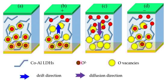 In consideration of low current density and gradual change in current, in combination with the above analysis for the mechanism of analog resistive switching, as previously reported, formation and migration of oxygen vacancies in LDHs are energetically expedient [48]. In addition, low electron affinity of oxygen (compared to its first ionization energy) may be conducive to formation of O2− ions. Hence, we put forward here a simple model based on the drift-diffusion principle to explain the resistive switching process. Gradual change in the resistance state for the Co–Al LDHs memristor is due to drift and diffusion of oxygen ions and vacancies under applied voltage. A schematic diagram of resistive switching of the Co–Al LDHs memristor is shown in Figure 8. Figure 8a shows oxygen ion and oxygen vacancy when no voltage is applied to the device. For positive voltage applied to the Al top electrode, O2− ions drift towards the Al top electrode, forming O vacancies among the Co–Al oxide octahedron, as shown in Figure 8b. These O2− ions have a tendency to accumulate on the surface of Co–Al LDHs as a “sheet charge”. While O2− ions may diffuse back into the dielectric because of the high concentration gradient, as shown in Figure 8c, the flux by reason of drift keeps most ions intact in the sheet charge. Hence, devices are gradually converted from HRS to LRS. In the negative voltage sweep, the drift effect has a tendency to gradually reduce, and the diffusion flux begins to dominate. This will lead to O2− ions to diffuse back to passivate the O vacancies, as shown in Figure 8d, resulting in the drop of device conductivity, which converts devices from LRS to HRS.