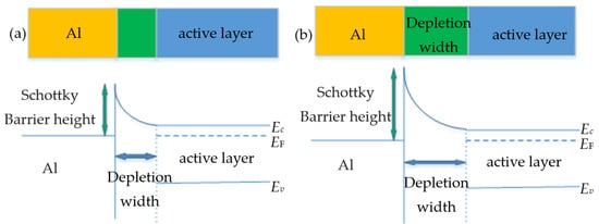 Schematic diagram of the change of Schottky barrier under the applied voltage to form a depletion layer: (a) under the positive voltage and (b) under the negative voltage.
