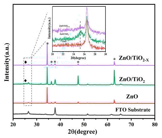 XRD patterns of ZnO, ZnO/TiO2, ZnO/TiO2-X, and FTO substrate samples (* represents the peak position of the hexagonal ZnO with a wurtzite structure and ♦ the peak position of TiO2 anatase phase).