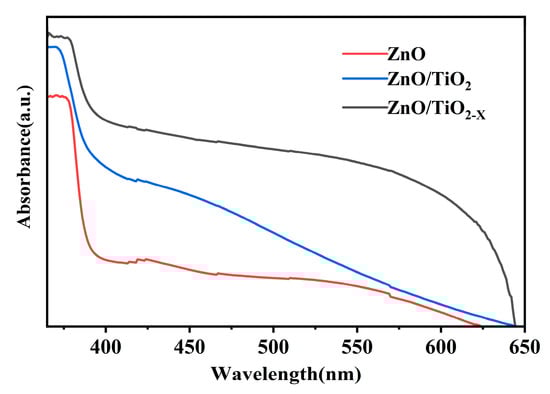UV-Vis diffuse reflectance spectra of the pure ZnO, ZnO/TiO2, ZnO/TiO2-X samples.
