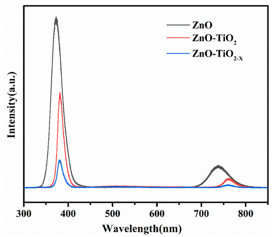 To judge the quality of ZnO crystals and perform the mechanism of photoinduced charge carriers and interfacial charge transfer over the ZnO/TiO2-X heterostructures, the room temperature PL spectra of the three synthesized samples are shown in Figure 6. The pure ZnO nanorods show a strong and sharp ultraviolet luminescence peak at ~372 nm, originating from the near band gap excitonic emission, and the other is located at ~738 nm, which is attributed to the second-order diffraction peak emitted at the ultraviolet band [45]. No obvious defect emission is seen in the yellow-green wavelength band of visible light, indicating that the ZnO nanorods prepared in this way have good crystallinity and fewer surface defects [46,47]. After coating with TiO2, the emission intensity is significantly reduced, which indicated that the composite materials reduce the recombination probability of photogenerated e−/h+ pair. It is worth noting that the black TiO2-X mesoporous spheres/ZnO nanorods heterojunction has the lowest electron-hole recombination rate. Therefore, the unique heterostructure photocatalyst of the ZnO/TiO2-X has a positive effect on the effective separation of photogenerated carriers during the photocatalytic reactions charge carriers. This considering the fact that the number of oxygen vacancies in titanium dioxide is too low to be disclosed, it can be easily explained that the significantly defect emission peak by oxygen vacancies in the PL was not observed. It is worth noting that the emission peak of ZnO nanorods shifted to the right after coating with TiO2-X. This behavior may be due to the quantum confinement stark effect [48,49,50]. Therefore, the type II band structure of ZnO/TiO2-X promotes the excited carriers, which confines the electron-hole recombination, and results in the emission intensity decreases. From the electron dynamics point of view, the observed lifetime shortenings obviously indicate an improvement in the charge separation for the ZnO/TiO2-X, leading to an increase in photocatalytic performance (as below).