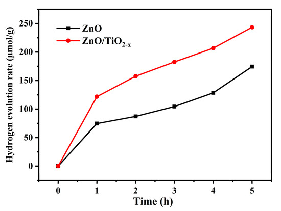 Using methanol as the electron donor and Pt as the co-catalyst, the photocatalytic hydrogen evolution experiment is carried out under AM 1.5. Figure 8 shows the results of hydrogen evolution experiments of ZnO and ZnO/TiO2-X materials. After 5 h of xenon lamp irradiation, ZnO/TiO2-X nanocomposites exhibited significant photocatalytic activities towards H2 production performance, and its hydrogen evolution amount reaches 243.4 μmol·g−1 better than the previous reports [51,52]. The addition of TiO2-X has a significant effect on the photocatalytic activity of ZnO, indicating that the TiO2-X hollow structures could promote more effective photons absorption and prolong the lifetime of the photo-induced electrons to a certain extent.