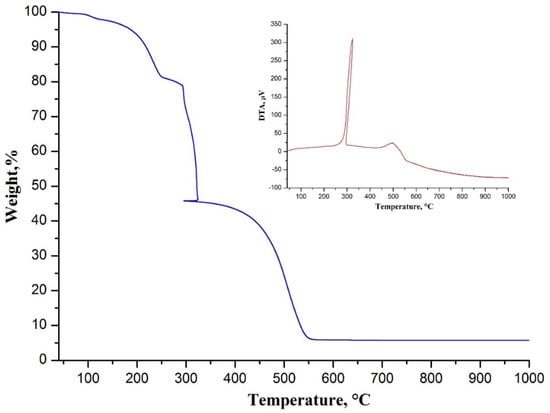 According to the TGA curve there were several weight losses during their transformation to ceramic ones. The first minor weight loss before 160 °C was associated with the removal of the residual solvent in the composite fibers. The second weight loss results from ZrAA initial decomposition accompanying with the oxidative stabilization of PAN after 290 °C confirmed by the exothermic peak at 324 °C on the DTA curve (insert of Figure 1) [26]. During the stabilization process intramolecular and intermolecular cyclization of PAN occurred. The last significant weight loss ending near 550 °C was attributed to further ZrAA decomposition leading to ZrO2 formation and also PAN combustion confirmed by the exothermic peak at 495 °C on the DTA curve (insert of Figure 1).
