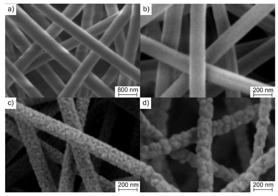 Scanning electron microscope (SEM) Merlin (Carl Zeiss, Oberkochen, Germany) was used to examine morphology and the diameter of the fibers. X-ray diffraction (XRD) patterns were recorded in the 2θ range 20–80° by the X-ray diffractometer (XRD) D2 Phaser (Bruker AXS, Karlsruhe, Germany) using CuKα1 monochromatic radiation. XRD patterns were analyzed with the help of the PDF-2 Diffraction Database File compiled by the International Centre for Diffraction. The phase content was determined from XRD patterns by the Rietveld method. SEM and XRD measurements were carried out at room temperature. Nitrogen adsorption–desorption isotherms at −196 °C were registered with a gas sorption analyzer Autosorb iQ-C (Quantachrome Instruments, Boynton Beach, FL, USA). All samples were degassed under vacuum at 300 °C for 3 h before analysis. The specific surface area (SBET) was determined with the Brunauer–Emmett–Teller method in a relative pressure range of 0.05–0.35. The pore volume (Vsp) was determined from the amount of nitrogen adsorbed at the relative pressure of 0.99. The thermogravimetric analysis (TGA) and differential thermal analysis (DTA) were performed on the thermal analyzer EXSTAR TG/DTA7200 (SII Nano Technology, Tokyo, Japan) in air atmosphere with a heating rate of 10 °C/min.